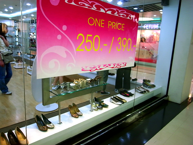 (↓↓左:百貨公司內便宜的鞋子250-390泰銖,但.....質感真的很差,買不下去....)
