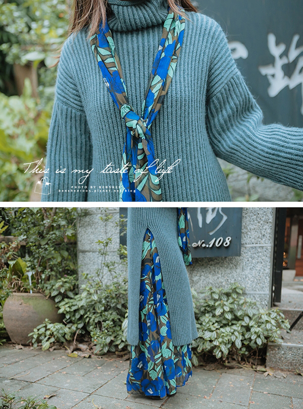 然後洋裝的腰帶,就可以當成圍巾來使用